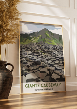 Capture the magic of Northern Ireland’s iconic coastline with this digital illustration of the Giant’s Causeway. Inspired by the dramatic hexagonal basalt columns and sweeping ocean views, this artwork brings one of the world’s most famous natural wonders to life in a modern, vibrant style.