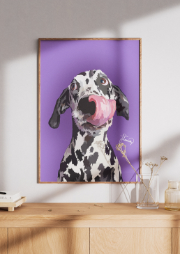 Bring a splash of colour and personality to your space with this hand-drawn digital portrait of a Dalmatian dog, captured with its tongue out in a playful and charming expression. The bold, vibrant purple background enhances the unique black-and-white coat of the Dalmatian, making it a striking piece for any dog lover or art enthusiast.