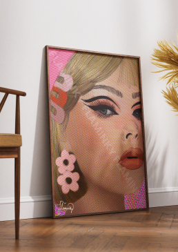 Retro Girlie is a digitally hand-drawn portrait from the Pop Nostalgia Series, capturing the charm of 60s-inspired fashion and beauty. The artwork highlights a glamorous figure with bold winged eyeliner, soft peach lips, and statement pink flower earrings. Set against a halftone pink backdrop, the piece radiates retro femininity while embracing the playful energy of pop art.