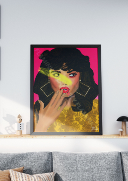 Retro Shock is a digitally hand-drawn portrait from the Pop Nostalgia Series, radiating bold expression and electrifying charm. The figure, styled with voluminous dark waves, dramatic brows, and square statement earrings, exudes vintage glamour with a modern twist. A vivid yellow brushstroke cuts across the eyes, amplifying the sense of surprise and attitude, while a hot pink halftone background and golden floral pattern complete the striking pop art aesthetic.